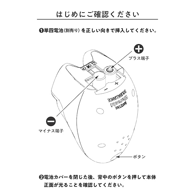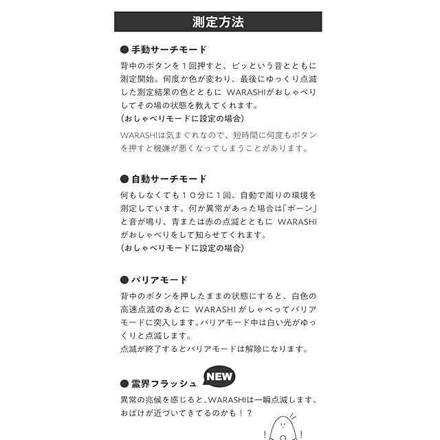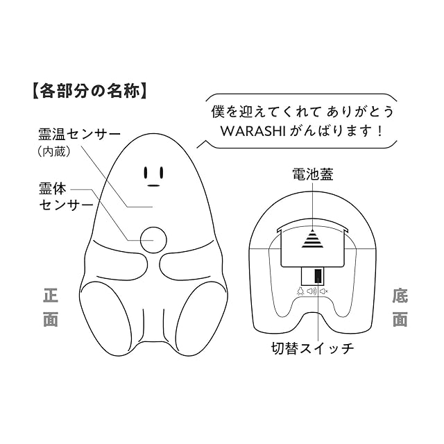 【お使いになる前に】底面の電池蓋をスライドすると蓋が外れます。+/− を間違えないように、単四電池2本(別売り)を入れてください。 【切替スイッチ】底面に切替スイッチがあります。取扱説明書を確認しながらご希望の設定に合わせてください。 ・人感ランプモード(動くものを捉えると一定時間ゆっくり色が変化します) ・おしゃべりモード(WARASHIがしゃべる通常モード) ・無口モード(WARASHIはしゃべりません)【測定方法】手動サーチモード/自動サーチモード/バリアモード/ 霊界フラッシュ(←新機能が追加)*本商品は当社独自の仮説に基づき開発・製造されたものです。必ず霊界とコミュニケーションが行えるというものではございません。取扱説明書をご確認の上使用方法に従い楽しくお使いください。