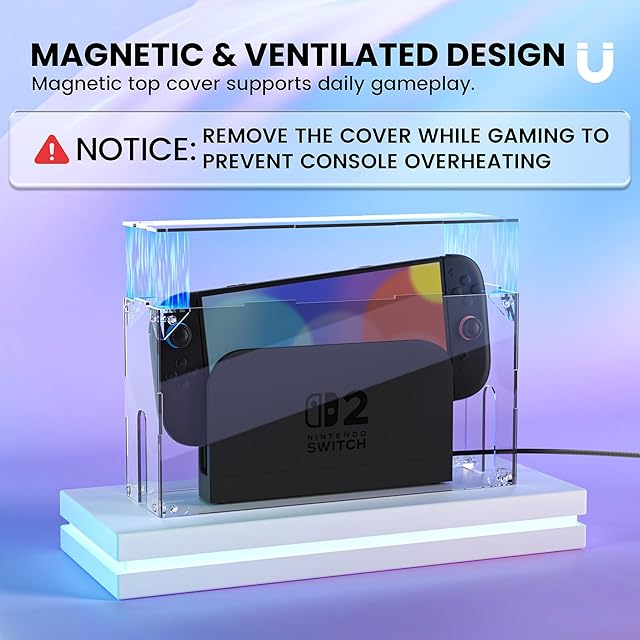 【ご注意】プレイ中は本体の過熱を防ぐため、トップカバーを取り外してください。<br> Nintendo Switch 2ドック本体専用の、スタイリッシュで透明なアクリル製防塵カバーが登場。<br> 高透過率のクリアアクリルを使用し、ドックと本体の美しいデザインを際立たせながら、ホコリやペットの毛、日常的な汚れからしっかりガードします。<br> マグネット式のトップカバーは、プレイ時と待機時で簡単に切り替え可能。ゲーム中はカバーを外し、使用後にはパチっと戻すだけ。背面下部には通気スロットを備えており、カバー全体を外さずにそのまま放熱を確保できます。<br> ご注意:トップカバーは使用時に取り外す必要があります。<br> 精密にカットされたポート周りの開口部により、ケーブルを抜かずにそのまま取り付け・取り外しが可能。日常の使用においてストレスなく扱えます。<br> 取り付けは工具不要。付属のガイドに従って、軽く押し込むだけでしっかり固定できます。<br> コレクターからカジュアルゲーマーまで、見た目の美しさと使いやすさ、安心の保護を兼ね備えた逸品です。<br><br> セット内容:<br> Nintendo Switch 2充電ドック用アクリル防塵カバー*1(※ドック本体は含まれません)<br> 取り付けキット*一式<br>