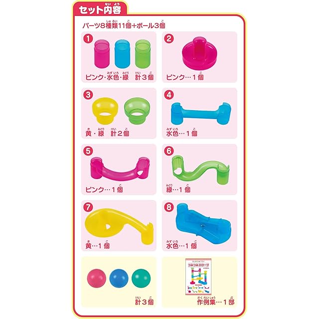 【セット内容】パーツ8種類11個+ボール3個(ボール直径45mm)、作例集1部 【対象年齢】2歳以上推奨