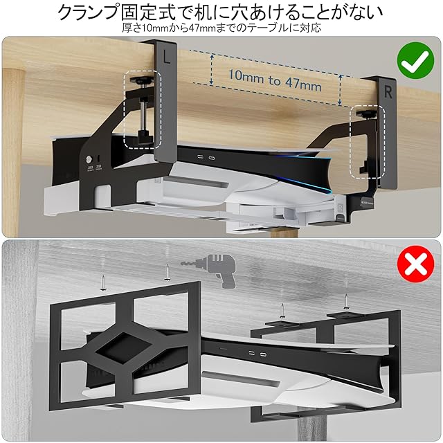 【スペース節約】PS5デスク下収納の左右のマウントは調節可能なデスククランプを備えており、さまざまな厚さのデスクに柔軟に対応できます。PS5マウントはしっかりと固定されるだけでなく、デスク下のスペースを最大限に活用します。