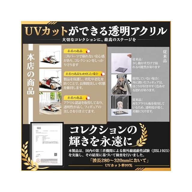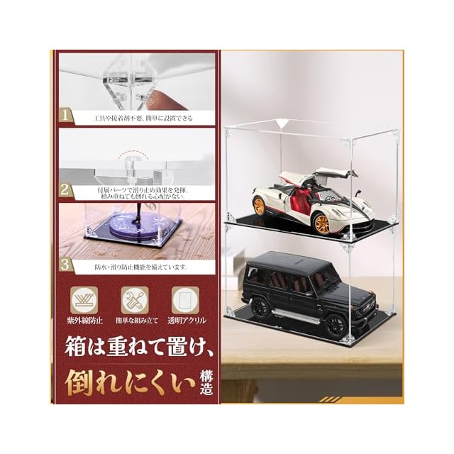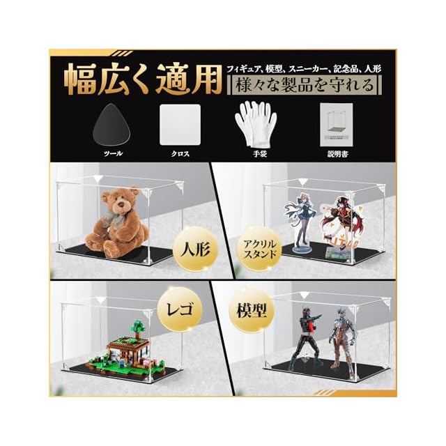 【材質・カラー】材質:アクリル;色:透明アクリル板+黒い台座 【サイズ·パッケージ内容】サイズ:(外寸)横幅35×奥行25×高さ25cm;パッケージ内容:台座(黒い板)、背板(アクリル板)、侧板 、ドア板(マグネット付き)、天井板;三角連結パーツ(マグネット無し)×6、三角連結パーツ(マグネット付き)×2、固定ピン複数個(余分あり)、滑り止めパッド×6;保護フィルム除去ツール、クロス、手袋