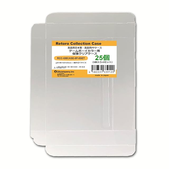【商品説明】<br> ■3Aカンパニーの「RetoroCollectionCase/レトロコレクションケース」シリーズ商品です。<br> ■ゲームボーイカラー(GBC)や後期ゲームボーイ(GB)ソフトの外箱にジャストフィット!大切なコレクションをキレイに保管!<br> ■若干余剰スペースが出ますがゲームギア(GG)ソフトにもお使いいただけます。<br> ■PVC素材のハードケースで大切なコレクションを衝撃・箱潰れ・傷・汚れから守ります。<br> ■経年劣化が進むレトロゲームの外箱も当製品でしっかり保護。<br> ■プレミアム商品や思い出のソフトのディスプレイケースとしてもおすすめです。<br> ■東京都の包装関連製造工場で製作した高品質日本製保護クリアケースです。<br> ■お得な25枚入り、組み立て式。<br> ■ヤフオク・メルカリ・ラクマなどの出品・も保護フィルムに入れて送ればキレイにお届け。<br> <br> 【商品仕様】<br> ■対象商品:ゲームボーイカラー・後期ゲームボーイ・ゲームギア用ソフト(通常パッケージ用 、初期ゲームボーイや特殊パッケージ除く、ゲームギアソフトは余剰スペースが出ます。)<br> ※GBC・後期GB通常パッケージサイズ(約):縦122×横97×奥行21mm(状態によって若干サイズが変化している場合があります。)<br> ※初期GB通常パッケージサイズ(約):縦103×横88×奥行19.5mm(状態によって若干サイズが変化している場合があります。)<br> ※GG通常パッケージサイズ(約):縦110×横95×奥行22mm(状態によって若干サイズが変化している場合があります。)<br> ■素材:PP<br> ■入数:25枚(5枚パック×5個)<br> ■サイズ:縦123×横98×奥行23mm、ケース厚み25μ<br> ■生産国:日本(東京都)<br> ■発売日:2021年5月15日<br> ■期間:初期不良のみ<br> ■メーカー名:3Aカンパニー<br> ■ブランド名:RCC(RetoroCollectionCase/レトロコレクションケース)<br> ■型番:RCC-GBCASE-5P-5SET<br> <br> 【ご注意事項】<br> ・画像のゲームソフトは付属いたしません。<br> ・通常パッケージサイズ用です。特殊サイズのケースでは入らない場合がありますのでご注意ください。<br> ・衝撃や重圧から保護するものではありません。<br> ・任天堂ライセンス商品ではありません。<br> <br> 【RCCシリーズ 5個入り】<br> ●スーパーファミコン用保護クリアケース 5枚<br> 型番:RCC-SFCCASE-5P<br> ●ファミコン用保護クリアケース 5枚<br> 型番:RCC-FCCASE-5P<br> ●メガドライブ用保護クリアケース 5枚<br> 型番:RCC-MDCASE-5P<br> ●ゲームボーイカラー用保護クリアケース 5枚<br> 型番:RCC-GBCASE-5P<br> ●ゲームボーイアドバンス用保護クリアケース 5枚<br> 型番:RCC-GBACASE-5P<br> <br> 【RCCシリーズ 25個】<br> ●スーパーファミコン用保護クリアケース 25枚<br> 型番:RCC-SFCCASE-5P-5SET<br> ●ファミコン用保護クリアケース 25枚<br> 型番:RCC-FCCASE-5P-5SET<br> ●メガドライブ用保護クリアケース 25枚<br> 型番:RCC-MDCASE-5P-5SET<br> ●ゲームボーイカラー用保護クリアケース 25枚<br> 型番:RCC-GBCASE-5P-5SET<br> ●ゲームボーイアドバンス用保護クリアケース 25枚<br> 型番:RCC-GBACASE-5P-5SET<br> <br>
