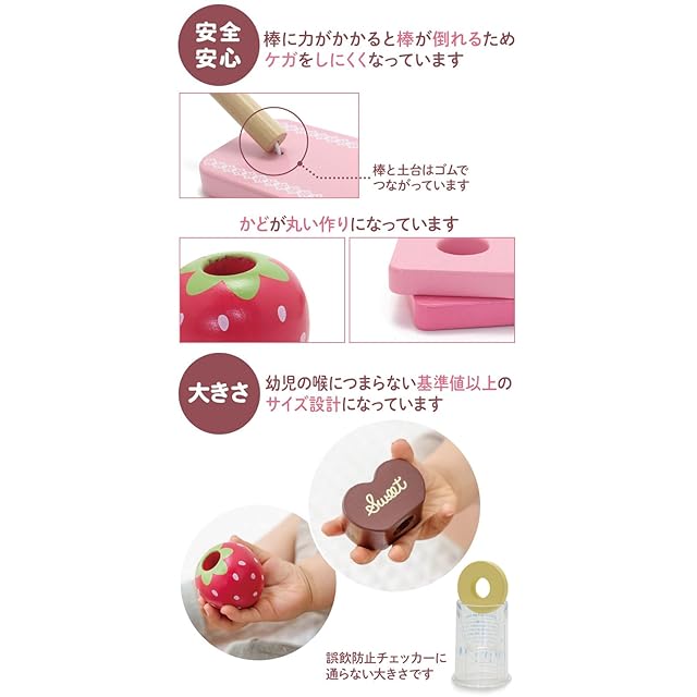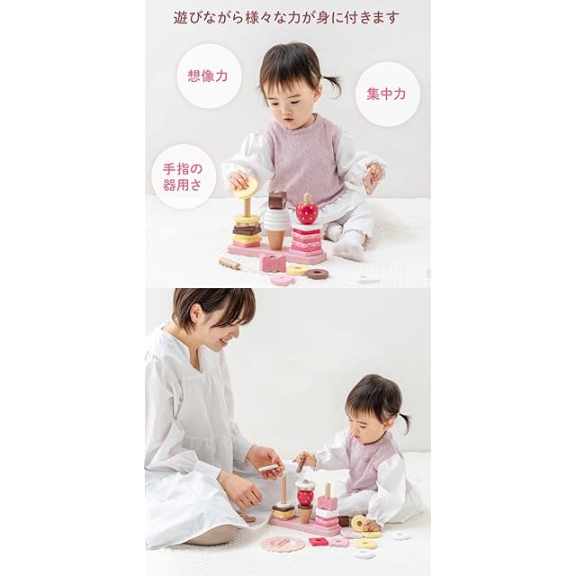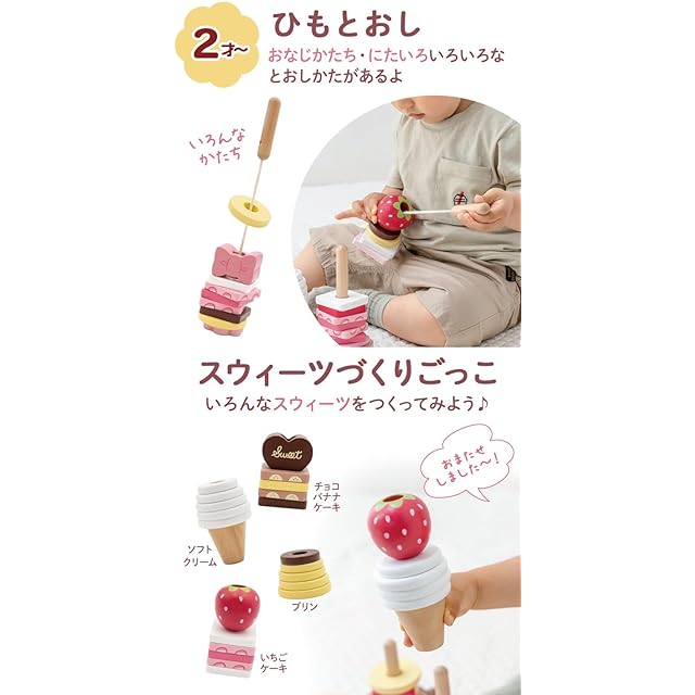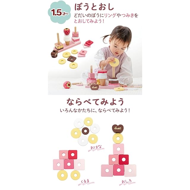 ご出産のプレゼントとしてお選びいただけるマザーガーデンの1.5才からお使いいただける木製おもちゃ<br> 楽しく学べる35種の遊び<br> 「積む・棒通し・ひも通し・スウィーツづくりごっこ・色並べ・形集め・バランスゲーム」など、成長に合わせた遊び方のアイデアがいっぱい!<br> 1.5歳から長く遊べる知育おもちゃです。<br> <br> 【安心】1.5才からのお子様に安心してお使いいただくため、かどが丸い作りになっています。<br> 【塗料】この製品に使われている塗料は、日本の食品衛生法の試験に合格し安全基準を満たした、水溶性塗料を使用しています。お子様が舐めても安心してご使用していただきます。<br><br> ※スタンド棒を4本から3本に仕様変更し、価格を改定させていただきました。<br><br> 【セット内容】<br> ・スタンド<br> ・ルーレット<br> ・ひもとおし<br> ・つみきパーツ(いちご・チョコ・りぼん・コーン)<br> ・リング×25(丸型茶色×1・丸型黄色×4・丸型白色×5・四角茶色×4・四角黄色×1・四角ピンク小×3・四角ピンク中×3・四角ピンク大×2・四角白色×2)<br> ・遊び方ガイド<br><br> 【サイズ】<br> ・スタンド:約22.4×7×高さ14.5cm<br> ・ルーレット:径約12cm<br> ・ひもとおし:全長約28cm<br> ・いちご:約4.9×4.8cm<br> ・チョコ:約5.2×3×3.5cm<br> ・りぼん:約5×3×3.5cm<br> ・コーン:約径4.5×高さ4.5cm<br><br> 【商品箱サイズ】約23.2×19.4×8.2cm<br><br> 【素材】<br> ・木製(天然木、MDF)<BR>※MDFとは、木質繊維を原料とする成型板です<BR> ・繊維<BR> ・丸ゴム<BR> ・ニッケルメッキ<br><br> 【塗料について】日本の食品衛生法の試験に合格し、安全基準を満たしております。<BR> また水性塗料のため、ウェットティッシュなどを使用し、強くこすると色落ちする場合がございますので、ご注意下さい。<br><br> 【対象年齢】1.5才以上<br> 【原産国】中国<br> ■ギフトバッグ(別売り)の適応サイズは3Sサイズとなります。<br>