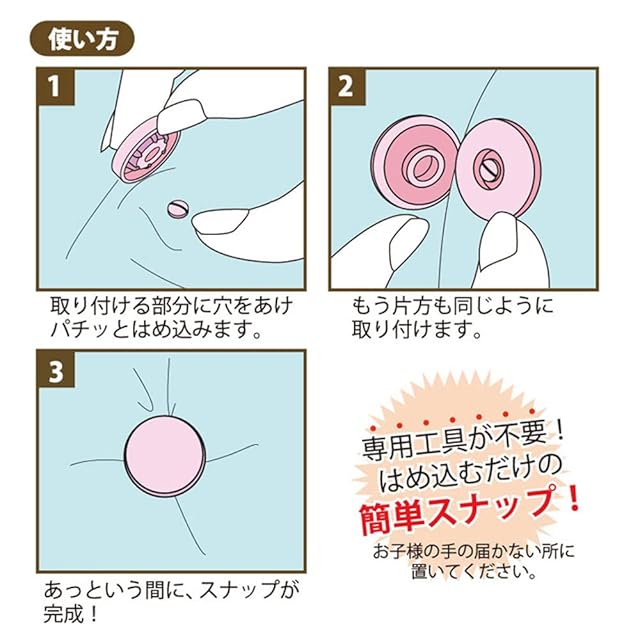 針・糸・工具不要!はめ込むだけで超簡単!専用工具が不要です。許容範囲以上に厚い場所にスナップを打ちつけると、外れる恐れがあります。取付素材を圧縮した状態で、アタマの足(先端)が2.5㎜出ていればOKです!※ 伸びる生地やタオル地に取付ける場合、不織布や接着芯で補強していただきますと、より外れにくくなります。