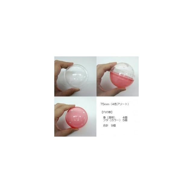 カプセルサイズ75mm、素材はPP,PSになります。日本のガチャガチャメーカー品で使用されている業務用カプセルです。カプセルには、安全性を考慮してそれぞれ小さな穴が空いています。
