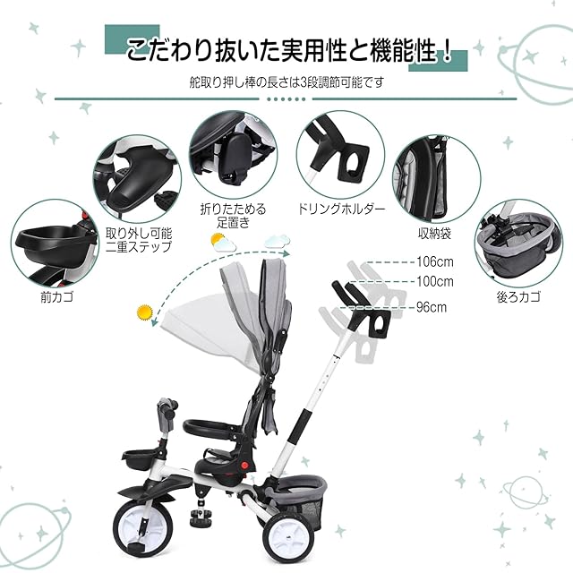 【1台5役子供用三輪車】5通りの使い方ができ、お子様の成長にあわせて長く楽しめる多機能三輪車です。ベビーカー、三輪車、様々なパターンで使える乗り物です。日光をカバーすることで暑さ対策に役立ち、ベビーカーのように使える点が魅力です。