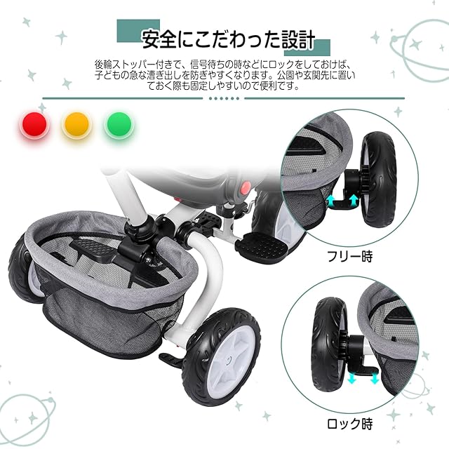 【安全にこだわった設計】シートベルトと安全カード付き、不意に身を乗り出したり、三輪車の揺れでずり落ちてしまうのを防ぎます。誤発進を防げるストッパー付きで、信号待ちや坂道に停車する際など、ペダルを漕いでも動かないよう固定したいときに便利です。