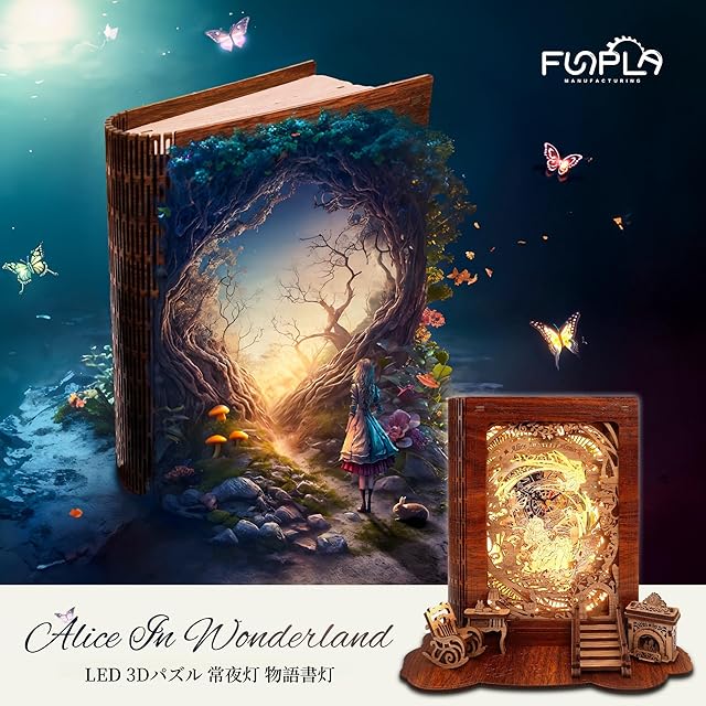 商品名:FUNPOLA 不思議の国のアリス 時空の旅 3Dパズル 立体パズル 夜灯 物語書 DIY LED 調光機能付き 木製パズル 手作り 家の装飾ランプ 知育玩具 おとぎ話 子供と大人向け 時計付き 日本語説明書付き 贈り物 71PCS