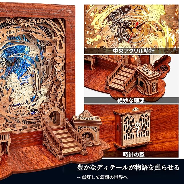 FUNPOLA 不思議の国のアリス 時空の旅 3Dパズル 立体パズル 夜灯 物語書 DIY LED 調光機能付き 木製パズル 手作り 家の装飾ランプ 知育玩具 おとぎ話 子供と大人向け 時計付き 日本語説明書付き 贈り物 71PCS