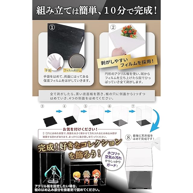 【組み立てやすい説明書、お手入れ方法付属】はがしやすい保護フィルムを採用。付属のフィルムはがし(円形アクリル)を用いて10分で簡単組み立てすることができます。アクリルはガラスと違いシンナーや溶剤に弱く、お手入れに注意が必要なため、お手入れ方法を付属しました。