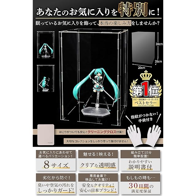 【選べるサイズ】フルミット フィギュアケース アクリル コレクションケース 高透明度 【UVカット】 透明収納ケース 組み立て 簡単 防汚れ 手袋 クリーニング クロス付き お手入れ方法 説明書 (縦20 x 横20 x 高30cm)