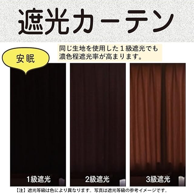 【注意事項】遮光1級生地でも、西日などの強い光の場合、光が漏れる場合がございます。色により光の透け方が異なり、濃色ほど透けづらくなります。