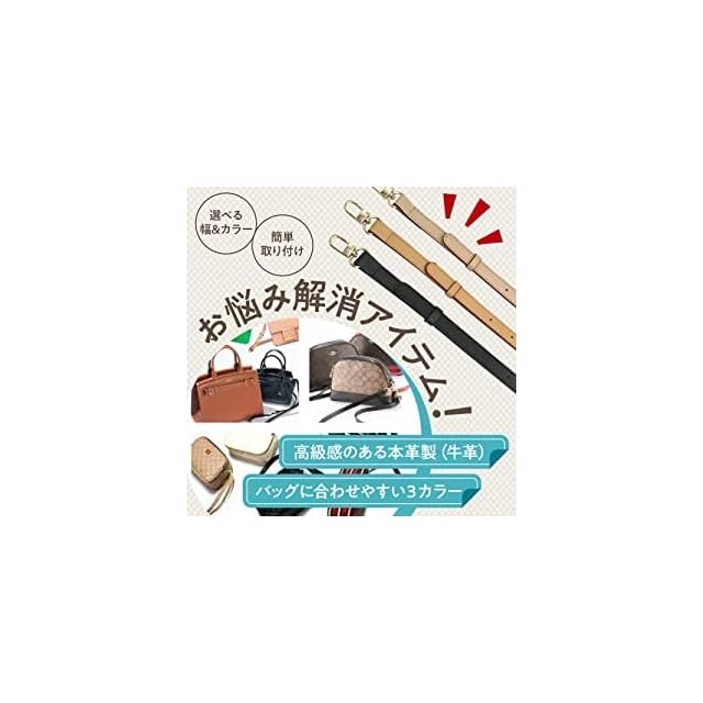 【 こんなお悩みございませんか? 】「お気に入りのバッグのショルダーベルトだけがボロボロになった」「長年使っていないバッグをイメージチェンジしたい」ショルダーストラップを交換しませんか?あきらめかけていバッグがよみがえります。<br><br>【 交換用ショルダーストラップ 】ショルダーバッグやハンドバッグ、クロスボディバッグにお使いいただける革レザー製の交換用ベルトです。シンプルなデザインなのでバッグを選ばずご使用いただけます。<br><br>【 高級感 】上質な牛革製で高級感がありますので、ブランド製のバッグにも交換可能です。金具も通常のナスカンと違いおしゃれなタイプを採用いたしました。安っぽいベルトはバッグに合わないという方にもご満足いただける仕上がりです。<br><br>【 サイズ詳細 】長さ:最短108㎝ 最長120㎝ (金具含む) 幅1.2㎝/1.5㎝ /1.8cm ベルト穴:5個 ベルト穴の間隔:3cm 金具を開けたサイズ:6mm 素材:本牛革 カラー:ブラック/ブラウン/ベージュ<br><br>【 30日保障 】30日間の返品がございますので、安心してお買い求めください。
