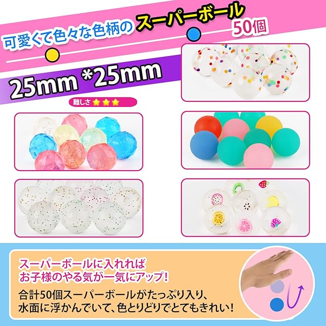 【お祭り気分を手軽に味わえる】縁日や御祭りはもちろん、こちらのスーパーボールセットを入手すれば、ビニールプールや大きめの桶に水を溜めるだけで、おうちでも金魚すくい、スーパーボール掬いを楽しめます。また、笛付きアヒル、金魚、カメ、ヒトデ、カニやドーナツを混ぜれば、すくい遊びをやるごとに難しさが変わり、お祭りの雰囲気をさらに盛り上げます。