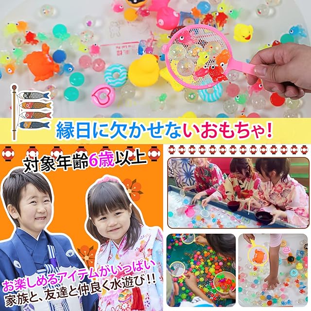 【セット内容】 <br>スーパーボール:50個(25mm*25mm) <br>だいきんぎょ:10個 <br>ミニきんぎょ:40個 <br>交換式すくい網付きポイ: 6本 <br>交換不可のすくい網付きポイ: 2本 <br>スペア紙: 1セット(100枚) <br>ドーナツ: 8個 <br>笛付きアヒル: 3個(親アヒル: 1個、子アヒル: 2個) <br>笛付き金魚: 1個 <br>笛付きヒトデ: 1個 <br>笛付きカメ: 1個 <br>笛付きカニ: 1個 <br>OPP製金魚袋:5枚 <br>合計129点