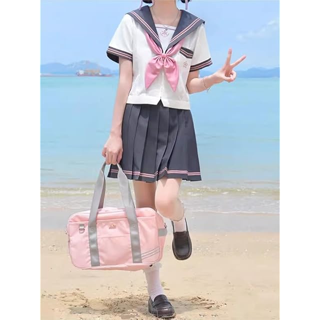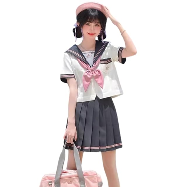 [YAISHN] セーラー服 制服 コスプレ ハロウィン 仮装 前開き 長袖 半袖 スカート 蝶結ぶ リボン プリーツスカート 人気 女子制服 本格制服 二本 JK 高校生 文化祭 学园歳 入学式 卒業式 清純 可愛い レディース 3点セット (L, 半袖セット)