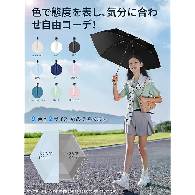 【大小2 種類のサイズ、傘下直径 90cm/100cm・9 色から選べます】90cm の小サイズは軽量で持ち運びが簡単で、いつでもどこでも風や雨を遮ってくれます。日常の通勤や買い物の際に、最適なお供となります。100cm の大サイズは、適切な遮蔽面積で、全方位の保護を提供します。突然の激しい雨でも、心配することはありません 。人それぞれユニークな個性とスタイルを持っています。UPEB が丹念にデザインした 9 色は、服との相性が良いだけでなく、それぞれ鮮明で特徴的です。傘を差して歩くすべての瞬間に、あなたが独一無二の風景になれます 。