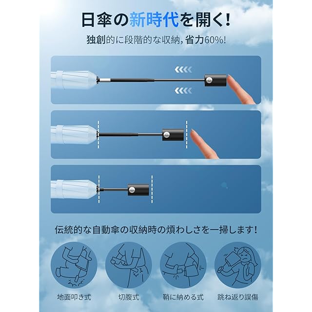 【業界初!進化型ワンタッチ自動開閉】新生チーム『日傘』が再び業界を震撼させる!UPEB独自の安全式段階収納自動おりたたみ傘は、反発を防ぎながら段階的に収納し、省力 60% となっており、小学 1 年生のお子様でも簡単に操作できます。伝統的な自動傘の収納時の面倒さ(地面に叩く方法、切腹式収納、鞘に入れる方式、跳ね返りによる誤傷など)を一掃します!」