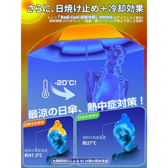 【JIS認証日傘・100%UVカット・100%遮光遮熱】UPEBの折りたたみ日傘は、一般の基準を100倍上回るJISの専門認証を獲得しています。日本の国家規格、JIS規格1925にてUVカット率100%を実証。JIS規格1055にて遮光率100%の実証済み!完全遮光の最高級日傘です。徹底的なUVカット率100%へのこだわり、厳しい暑さや日焼けから肌を効果的に守ります!紫外線A波(肌の深層まで届く)・紫外線B波(肌を赤くする)・紫外線C波、全ての波長の紫外線を100%UVカット!ドイツ「 Radi-Cool 反射冷却」特許技術のアイスシルク素材!開傘瞬間 20℃ダウン!一般黒・銀コーティング傘より涼しさ抜群!『涼しさを持ち歩ける』大人気の折りたたみ日傘です。
