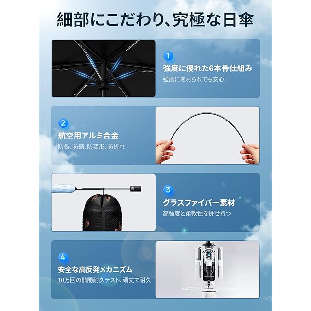 【耐久性が抜群・2年間の品質】UPEB軽量日傘は、三角形の力学構造、黄金比に近い設計、高品質で強化された素材を採用し、6級の強風に耐えることができます。コンパクトながらも、卓越した耐久性を備えており、安心して長期間ご使用いただけます。 UPEBは、長年、新技術・新製品を創造し続けています。そのために、研究開発に力を注ぎ続けています。常に業界トップクラスの品質を守り続けています。本製品は2年間の期間が付いています。万が一、商品に不具合が生じた場合には、弊社までご連絡いただければ、迅速かつ日本語で対応いたしますので、安心してご利用ください。
