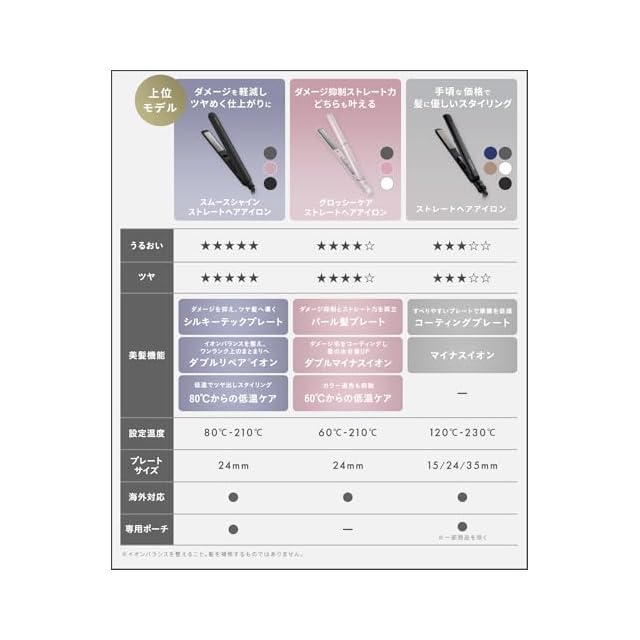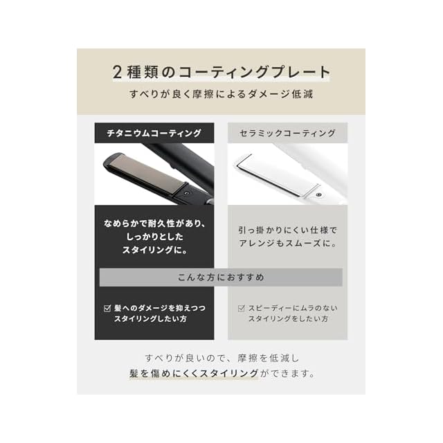 【髪にやさしくスタイリング】マイナスイオン搭載、カラーによって異なるすべりの良い2種類のコーティングプレート