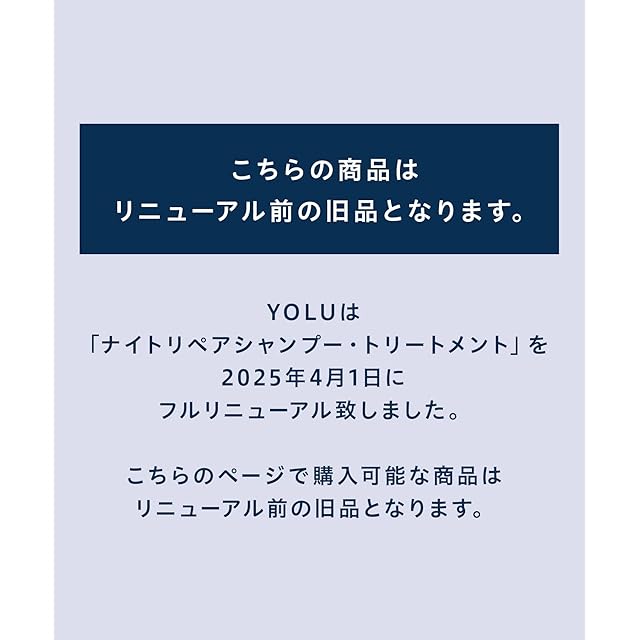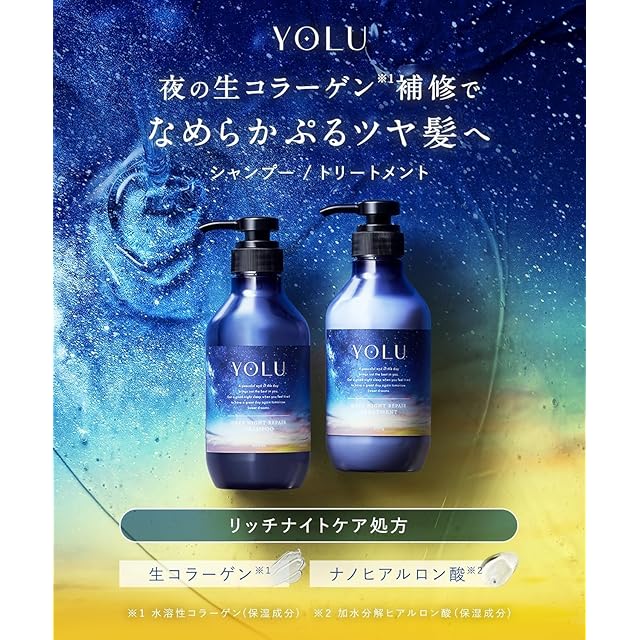 YOLU ディープナイトケア シャンプー ・ トリートメント ボトルセット 髪と地肌の濃密ナイトケアで、なめらかぷるツヤ髪へ 〈睡眠中の摩擦ダメージから髪を守る 〉 〇リッチナイトケア処方 ・生コラーゲン※1 高保湿の生コラーゲンでコーティングし、 毛髪の外側を集中補修 + ・ナノヒアルロン酸※2 高保水のナノヒアルロン酸で 内部に水分補給し、 毛髪の内側を集中補修 〇地肌の乾燥をケア。夜間美容エキス配合 ・ネムノキ樹皮エキス※3 ・クロノシャルディ※4 〇安らぎたい夜にベルガモット&ムスクの香り ベルガモットなどのみずみずしいすっきりとした香りに 優雅なムスクをブレンド 〇カラーやブリーチを繰り返し、ひどく傷んだ髪をケア ※1 水溶性コラーゲン(保湿成分) ※2 加水分解ヒアルロン酸(保湿成分) ※3 保湿成分 ※4 ブドウ果実エキス(保湿成分) パラベン、鉱物油、合成着色料フリー