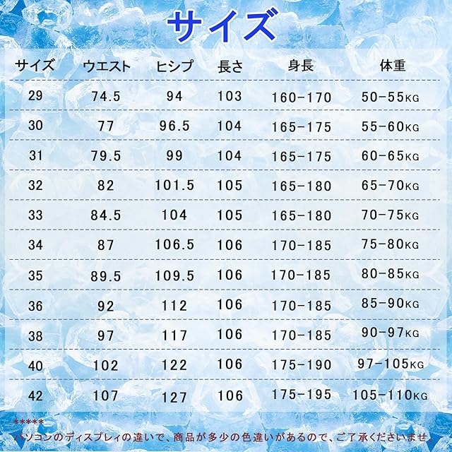 【SIZE:29】身長:160-170cm 体重:50-55kg【SIZE:30】身長:165-175cm 体重:55-60kg【SIZE:31】身長:165-175cm 体重:60-65kg【SIZE:32】身長:165-180cm 体重:65-70kg【SIZE:33】身長:165-180cm 体重:70-75kg 【SIZE:34】身長:170-185cm 体重:75-80kg【SIZE:35】身長:170-185cm 体重:80-85kg【SIZE:36】身長:170-185cm 体重:85-90kg【SIZE:38】身長:170-185cm 体重:90-97kg【SIZE:40】身長:175-190cm 体重:97-105kg 【SIZE:42】身長:175-195cm 体重:105-110kg