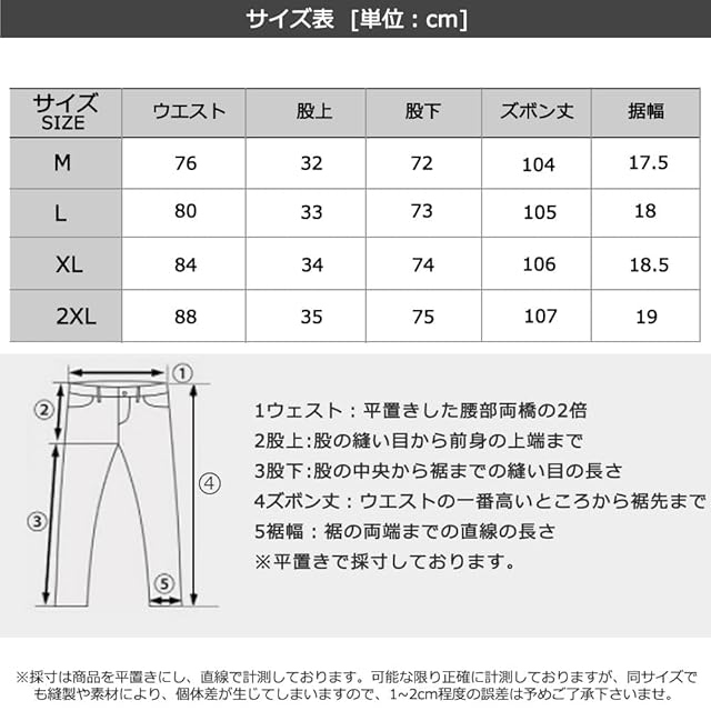 【XL】ウエスト:84cm ズボン丈:106cm/適応身長の体重:175-180cm 体重:70-75kg【2XL】ウエスト:88cm ズボン丈:107cm/適応身長の体重:180-190cm 体重:75-85kg