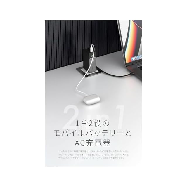 【1台2役のモバイルバッテリーとAC充電器】コンパクトなのに高速充電可能な、5000mAhのAC充電器一体型モバイルバッテリーです。USB Type-Cポートを搭載した、USB Power Delivery 45W対応モデル。これ1つでスマートフォンとノートパソコンを同時に充電できます。