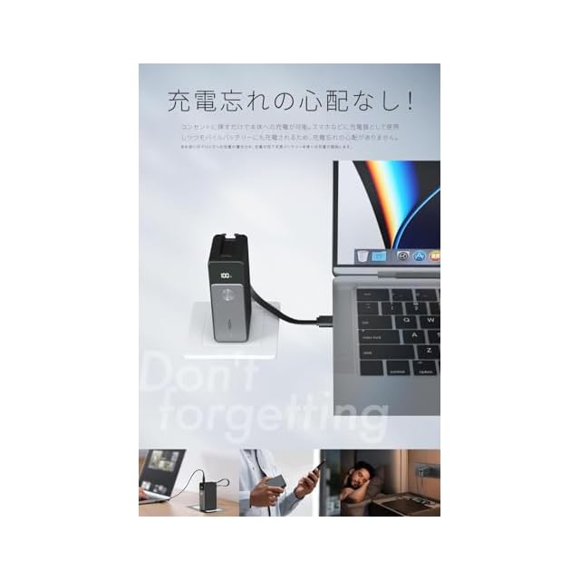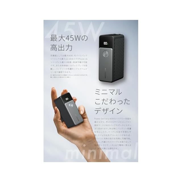 【ミニマルこだわったデザイン】Power Delivery 45Wのハイパワー性能を備えながら、手のひらサイズのコンパクト設計で、小さめのバッグやポーチにもすっきり収まります。外出時にバッテリー残量を気にしたり、ケーブルを探す手間も不要。カフェや出先でコンセントがあれば、デバイスと本体の両方を同時に充電可能。さらに、内蔵されたケーブルを取り出して接続するだけで、これ1台で簡単に使えます。や旅行の際にも便利です。