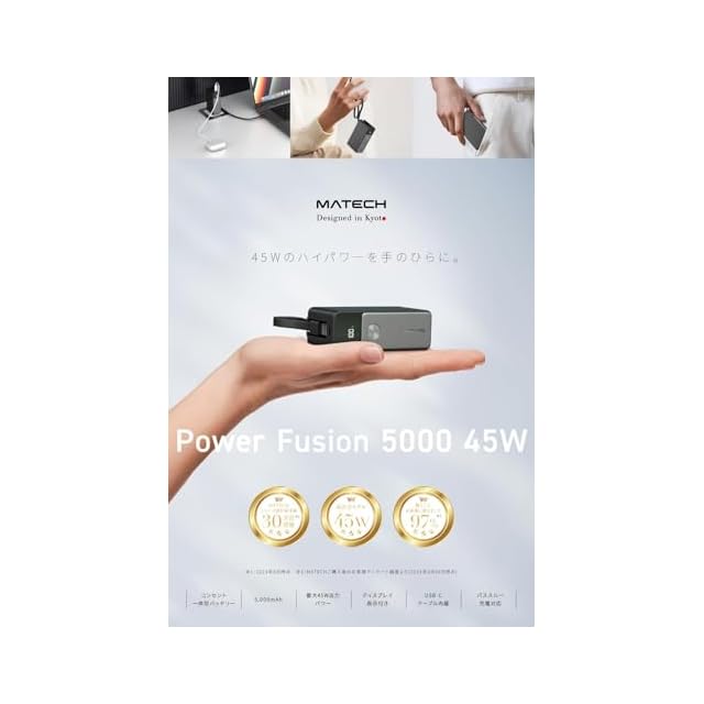 商品名:MATECH(マテック)® MATECH モバイルバッテリー コンセント一体型(45W出力, 5000mAh)【GaNUltra採用/LEDディスプレイ搭載/USB-Cケーブル一体型/コンセント一体型/折りたたみ式プラグ】iPhone MacBook Android その他機器対応 (PowerFusion 5000 45W) (メタリックブラック)