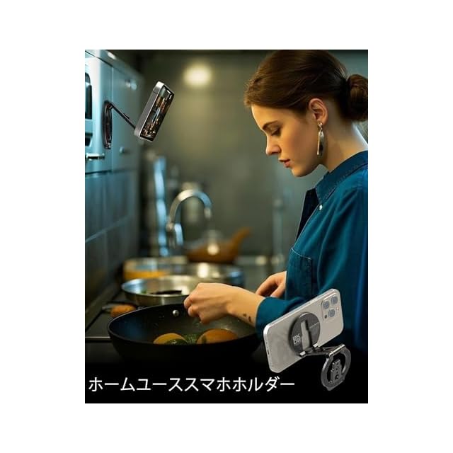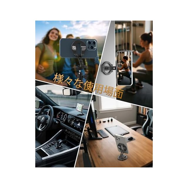 【多機能スマホスタンド】 車、冷蔵庫、レンジフード、キッチンなど、さまざまなニーズに応じて使用できます。カーナビ用のカーフォンマウントとして、テレビや動画視聴、ビデオ会議用のデスクトップスタンドとして活用できます。三脚に取り付けて自撮り、動画撮影、俯瞰ショット、ライブストリーミングにも最適です。デュアルサイドマグネットデザインにより、冷蔵庫、フィットネス機器、黒板などの金属表面にもしっかりと固定でき、あらゆる金属表面での使用にぴったりの相棒です。