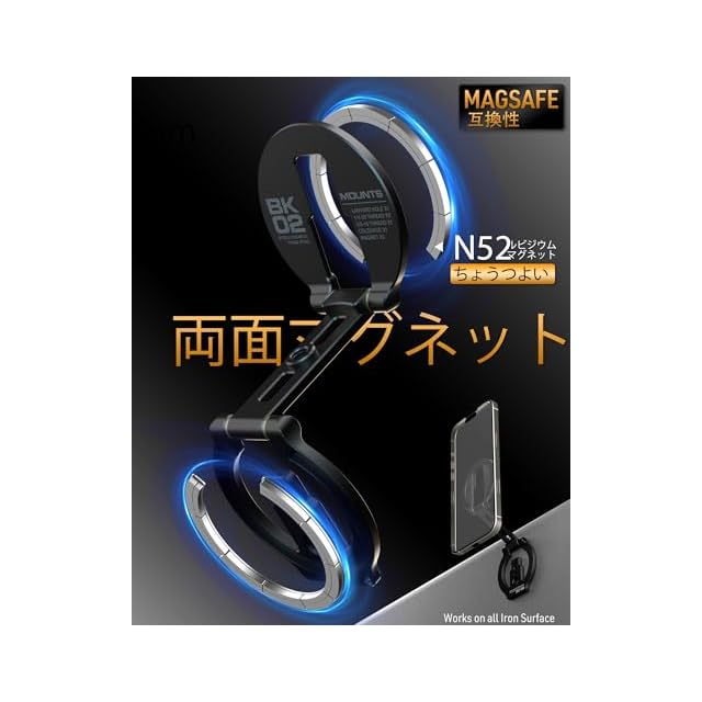 【超強力磁気、安定感抜群】超強力なN52グレードの磁石を採用しており、驚くほどの吸着力を実現します。超強力磁気で、簡単に脱着しません、安定で安心に使用いただけます。両面磁気があり、表側は携帯電話を吸着でき、裏面はLEDライト、スマホレンズフィルターキットなどのアクセサリーを吸着ことができます。ご注意:スマートフォン用ケースを装着している場合、製品の吸着に影響します。携帯電話ケースと併用する場合は、Mag Safe対応のケースを使用する必要があります。