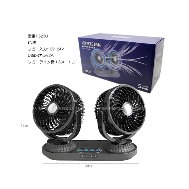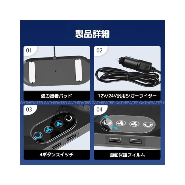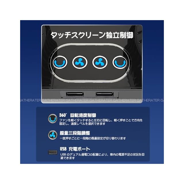 商品名:【2025年夏新登場 独立制御の双頭車載ファン】GATHERATER 車 扇風機 自動首振り 低騒音 タッチパネル 運転席 シガーソケット 車載扇風機 360°角度調節可能 3階段風量調節 DC12V/24V 3枚羽根 取付簡単 省エネ 夏対策 空気循環 日本語マニュアル