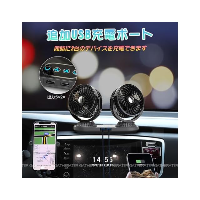 ✽【汎用USBポート付き】車用ファンには5V-2AのUSB充電ポートが搭載されており、スマホなどを直接充電することができます、シガーソケットを使われて充電できないという悩みを解消することができます。
