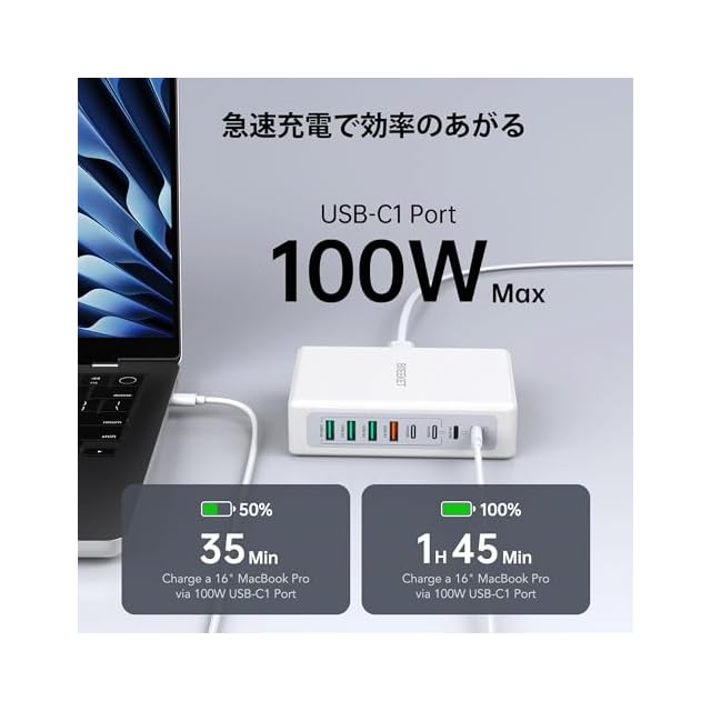 ⚡【必要な唯一の充電器】わずか1時間48分で、お使いのMacBook Pro 13インを100%まで充電できます。4 x USB C PD 3.0ポート(C1 /C2 単独利用で最大 100W/45W)、4x USB A ポート(最大15W) 充電器の数を少なくして、オフィスや自宅のデク周りはシンプルにすっきりとさせます。